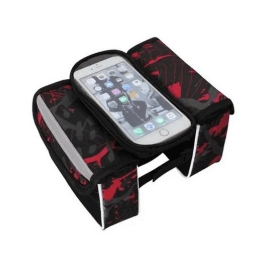 Este bolso permite llevar smartphones en el centro y a los costados cualquier tipo de accesorio. Se monta en la parte delantera, de la bici sobre el caño y sten.