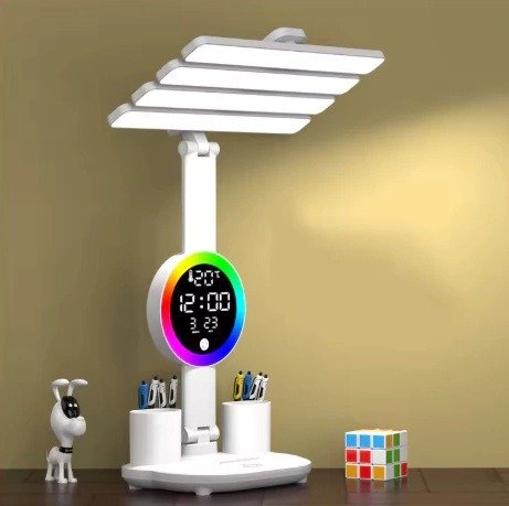 Iluminación LEDLuz LED con ahorro energético y varios niveles de brillo.Control táctilAjuste de encendido/apagado y cambio de intensidad con un solo toque.Temperaturas de colorLuz cálida, neutra y fría para diferentes ambientes (por ejemplo: lectura, estudio, descanso).Pantalla digitalMuestra hora, fecha, temperatura y, en algunos modelos, alarma.Luces RGBAro multicolor que puede cambiar de color de forma fija o en modo automático.Lapicero integradoCompartimientos para organizar bolígrafos, lápices u otros útiles de escritorio.Puertos adicionalesAlgunos modelos incluyen puerto USB para carga de dispositivos.AlimentaciónCable USB o conexión directa a corriente; algunos tienen batería recargable.Diseño plegableCabezal ajustable o plegable para dirigir la luz.